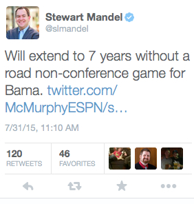 The other reason is Alabama or insert SEC team is not playing enough true road games against Power Five conference teams, and they should be. Proponents will then usually make reference to another team who has played true road games, and hold that team up as a model.