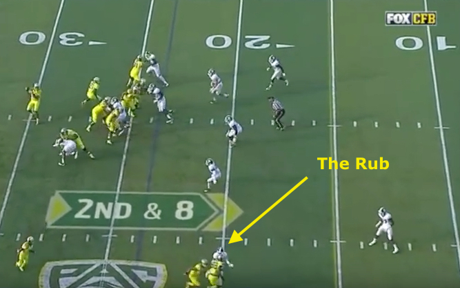 In 2014 Oregon sparked their comeback against Michigan State with a long touchdown pass in the 3rd quarter. The route in question, which is above, is a typical rub route.