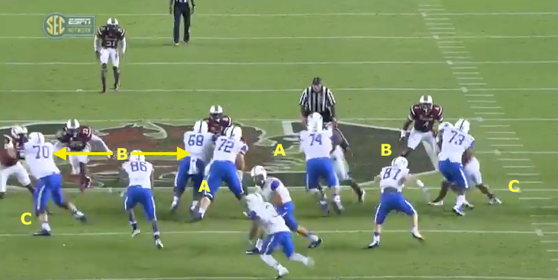 This play was very successful for Kentucky. On the play side (the left side of the diagram) look at the A gap. It’s gone, so no running back will be running through there, but the defense doesn’t have gap integrity there. The defensive tackle is being pushed back and away and is directly across from the center.