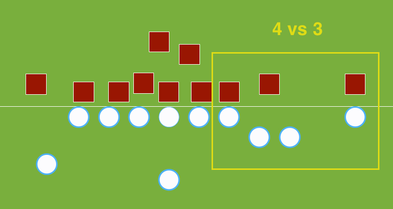 Ole Miss comes out in a formation with a pair of wing backs on the right side. Though they are in the backfield, the effect is to show an unbalanced line: there are four blockers on the line of scrimmage to the right of the ball and three to the left.
