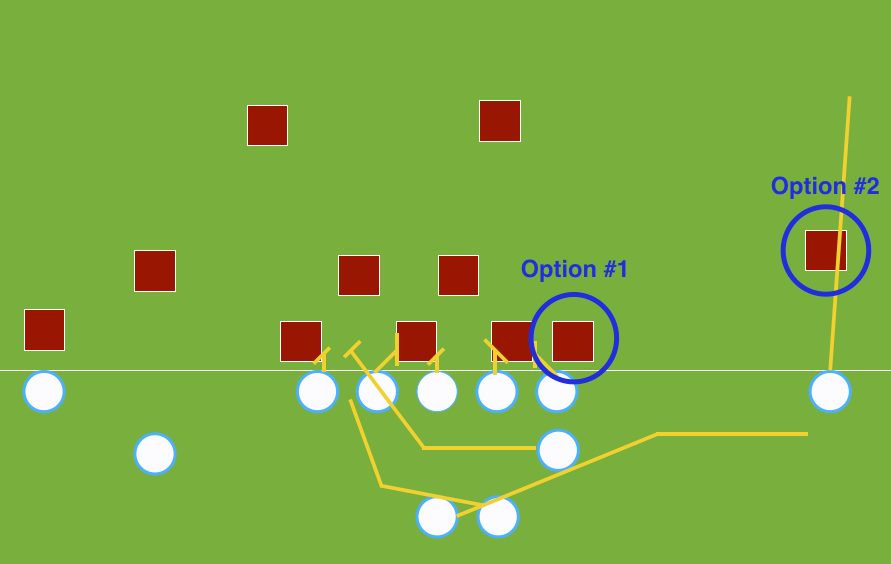 Two defenders do not have to be blocked because they are being optioned. First the defensive end isn’t blocked and he is the key to whether the ball will be handed to the running back going left or kept with the quarterback.
