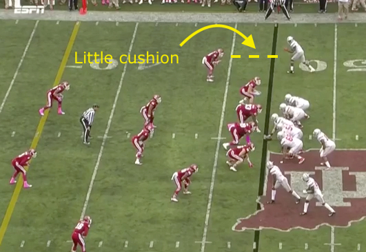Giving less cushion is better for defending quick passes, but it has the trade off of making it more likely the receiver can get deep or break a big play.