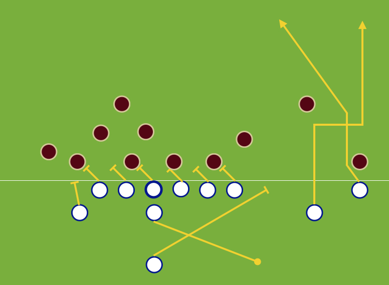 Florida State responds by playing man coverage and blitzing 6. The two receivers to the right side of the offensive formation are covered by the defenders across from them, man to man. The tight end, who is not eligible to receive a pass, is covered by the outside linebacker/nickel back. The safety has the running back, and the backside corner has the A back (or wingback) on that side.