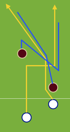The inside receiver runs a wheel route. (The combination of these two routes is often called the wheel, too.) On the wheel route the receiver runs up the field and cuts toward the sideline. He then makes a second cut vertically down the field. In man to man coverage, it is difficult for the defender to stay with the receiver through multiple cuts. Against a zone, the double cut conceals the ultimate destination of the play, which can lull deeper defenders into following other routes rather than staying in their zone.